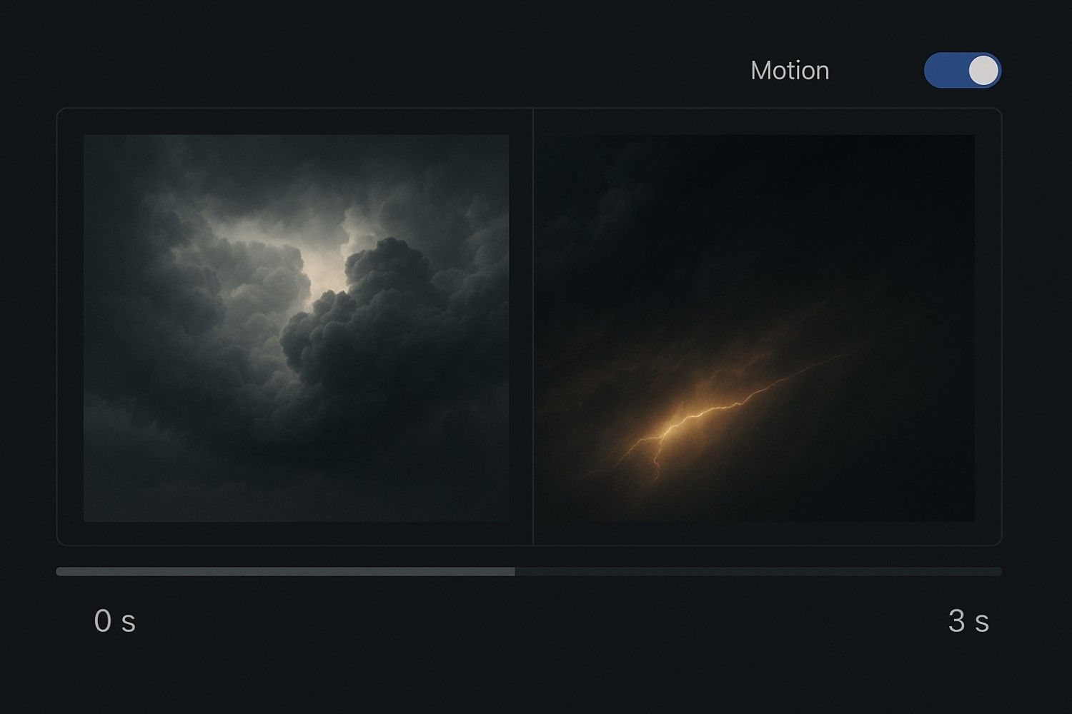 Leonardo.ai began as an image generator and later added a Motion toggle to its video menu. Upload a still (for example, rolling storm clouds), select Generate, and a three-second clip downloads without logos or outro cards.