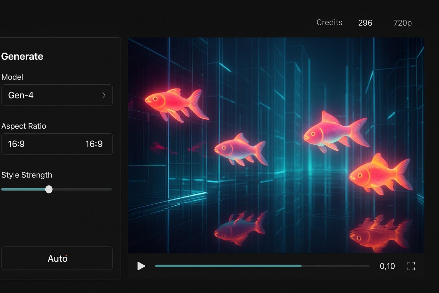Runway feels more like an AI laboratory than a template tool. Type a prompt—such as "neon koi fish swimming through a glass city"—and the latest Gen-4 Video model produces a five-second, 720p clip without a watermark.