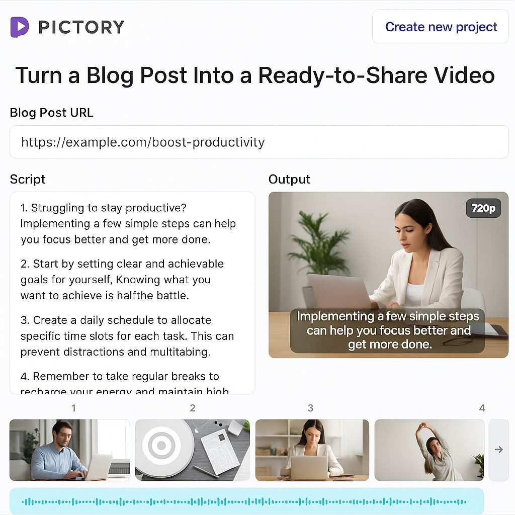 Most AI video apps start with a blank prompt. Pictory starts with a URL. Paste your article, click Generate, and the platform slices the text into short scenes, layers royalty-free clips, and adds an AI voice-over. About ten minutes later, you can download a captioned video that looks editor-made.