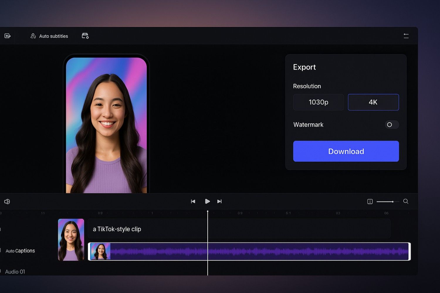 Auto-captions with styling: Generated subtitles come with trendy animation presets that match current TikTok and Instagram Reels aesthetics.