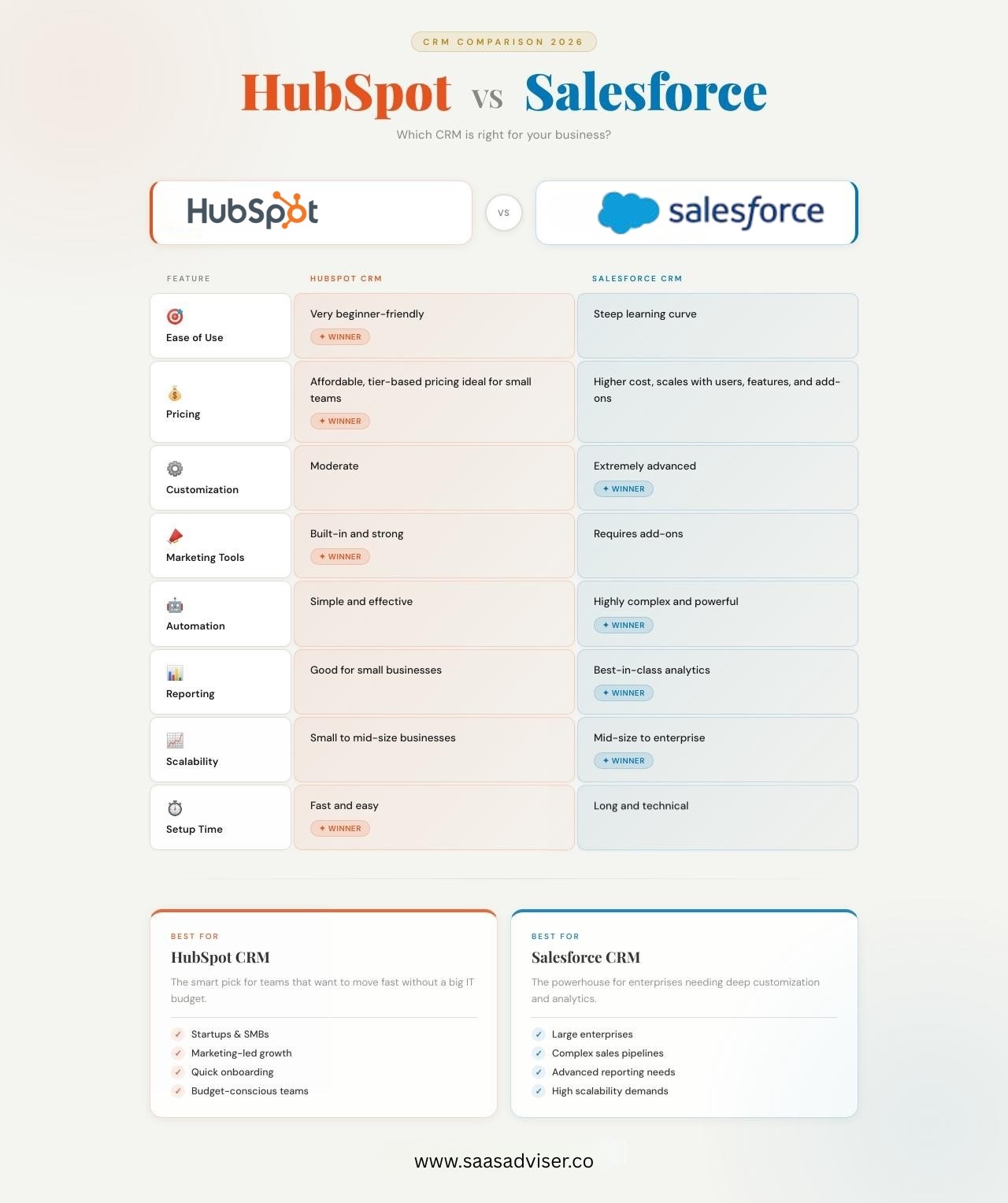 There is no single winner in the HubSpot vs Salesforce debate because the best CRM software depends on your business size, growth strategy, sales complexity, and internal resources. In 2026, success with a CRM is less about having the most features and more about choosing a system that aligns with how your team works, how quickly it can be adopted, and how well it supports long-term business goals.