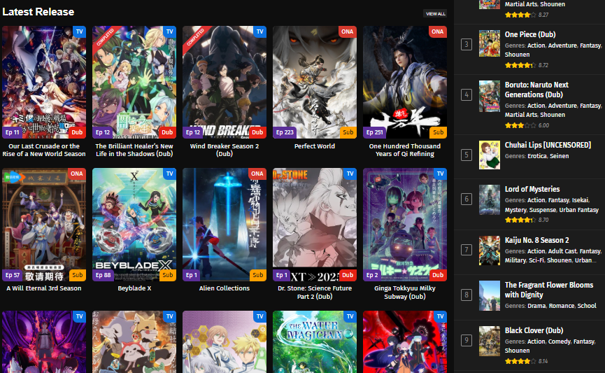 • Streams anime series and movies in both subbed and dubbed formats.