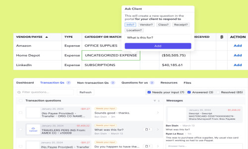 Client Portal: Facilitates secure and direct communication between bookkeepers and clients, allowing for transaction queries, automated reminders, and transaction reclassification based on client responses.