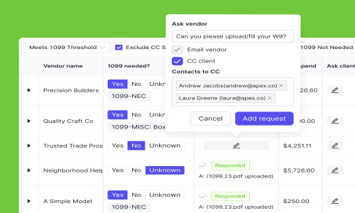 1099 Management: Identifies vendors requiring 1099s, facilitates W-9 collection directly from vendors, and allows for easy export and upload of 1099 data to filing tools.