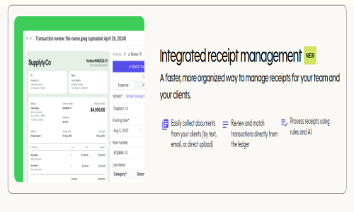 Integrated Receipt Management: Simplifies the collection of documents from clients through multiple channels, enables review and matching of transactions directly from the ledger, and utilizes AI