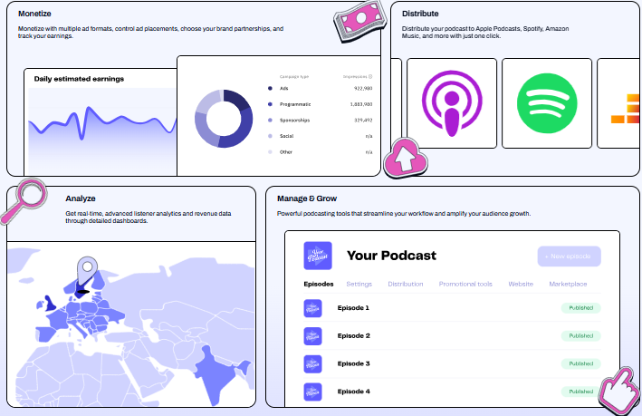 Distribution: Wide syndication to all major listening apps, customizable podcast websites, and embeddable players.