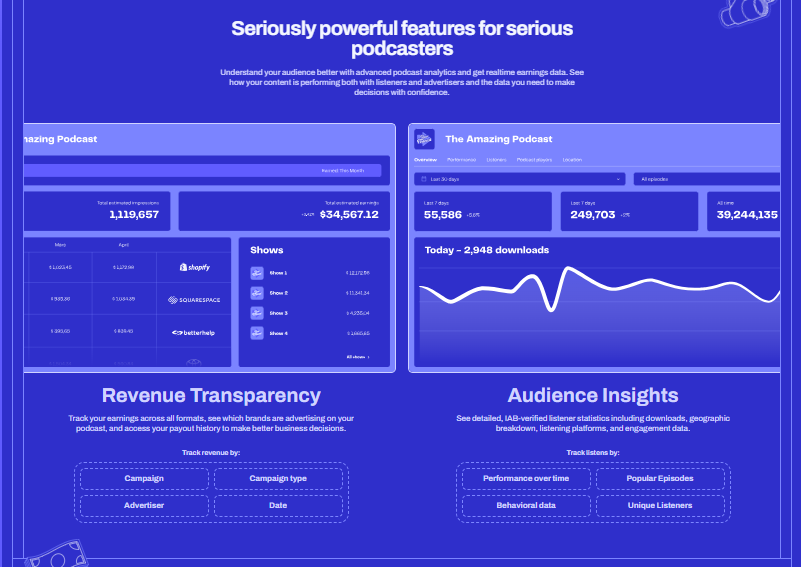 Analytics & Reporting: IAB-certified data, listener demographics, geographic insights, unique listener stats, real-time revenue tracking.