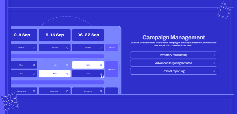 Campaign Tools: Inventory forecasting, ad targeting, pacing, frequency capping, customizable reporting.