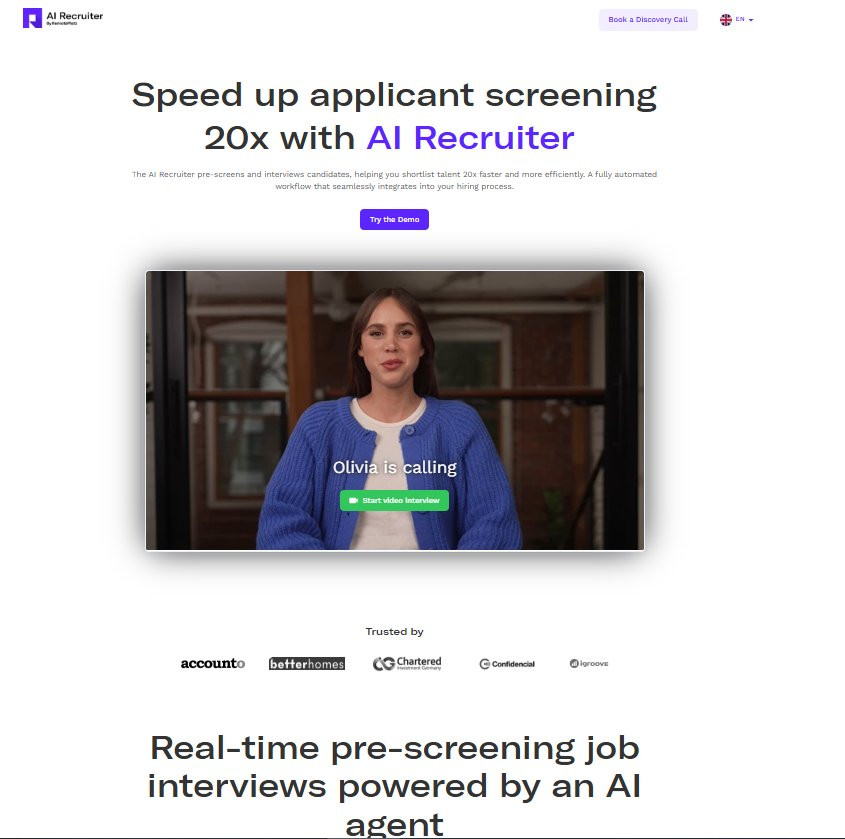 AI‑Recruiter pre-screens and interviews candidates, helping you shortlist top talent up to 20x faster. Powered by advanced conversational AI, it conducts video interviews, evaluates responses in real time, and delivers structured shortlists with transparent scoring. Unlike traditional resume screening, the AI recruiter can see, hear, and interact with candidates live via video call to evaluate their skills and experience. The fully automated workflow integrates seamlessly into your existing hiring process—reducing manual tasks, improving consistency, and ensuring every candidate gets a timely, personalized experience. It’s designed to support both high-volume recruitment and more focused hiring needs, adapting to the scale and structure of your team.
