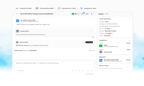 Aidlify includes helpful tools for team collaboration, like private notes and mentions, so agents can communicate behind the scenes. Automation features like macros let you set up quick replies or workflows for repetitive tasks.