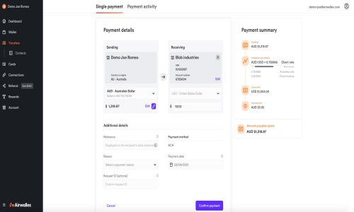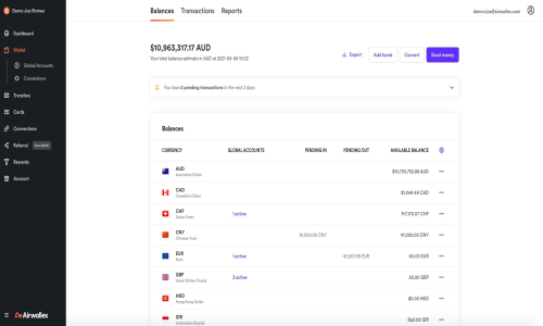 Airwallex is the Mobile Banking Software used for the below functionalities.