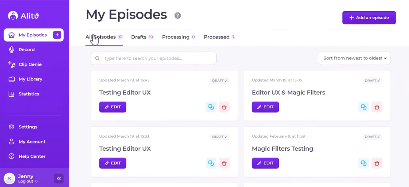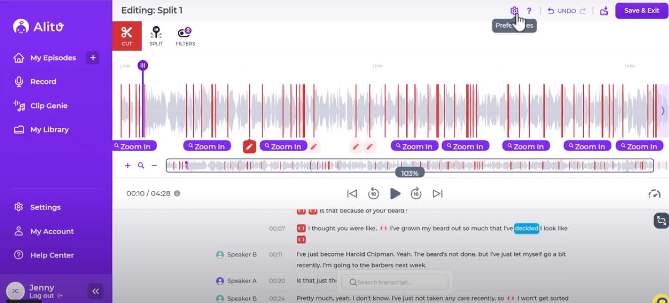 Editing in Alitu is simple, thanks to its hybrid approach. Podcasters can work with a waveform editor for fine control or use transcript-driven editing, where cutting filler words, tangents, or mistakes is as easy as deleting text. Drag-and-drop functionality makes it easy to insert music, ads, or pre-set templates, while AI-driven tools automatically clean up audio, equalize volume, and remove background noise. Magic filters further improve efficiency by automatically removing silences and unnecessary filler words.