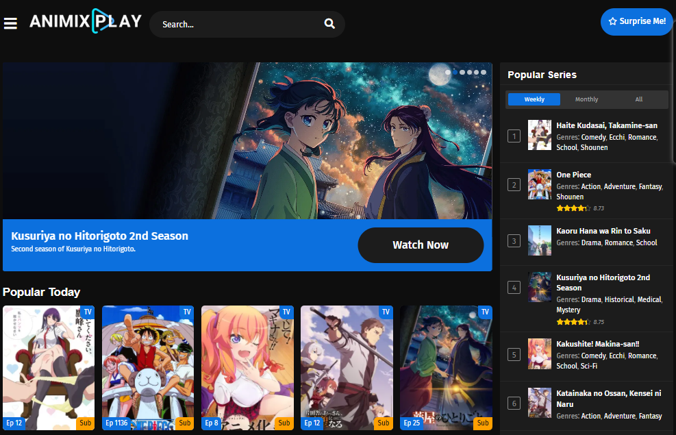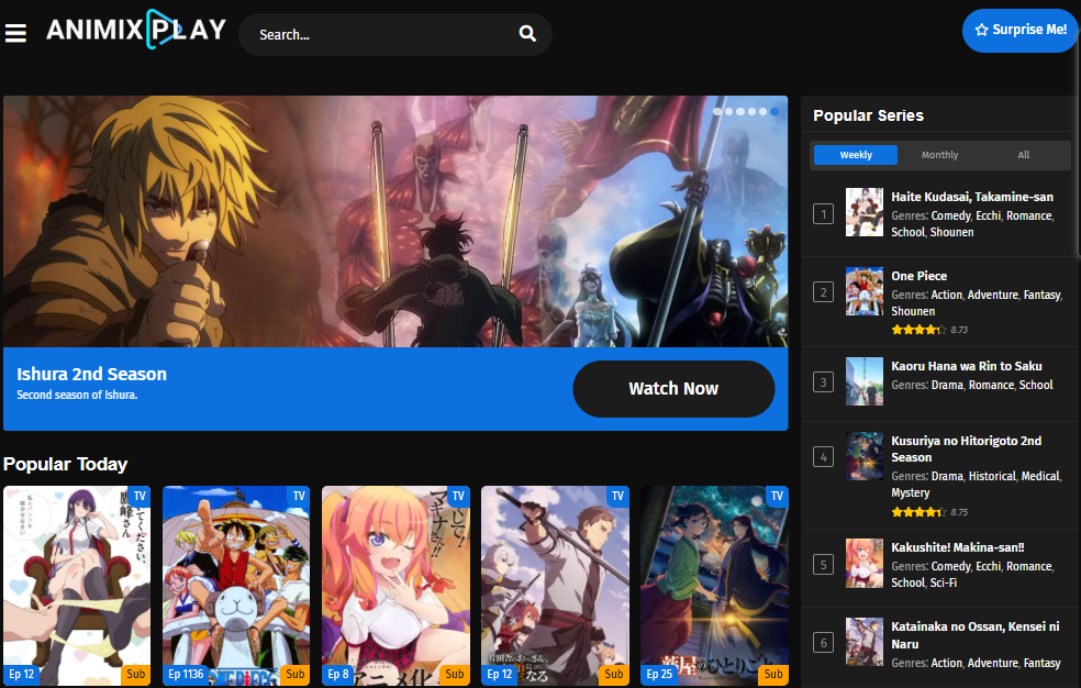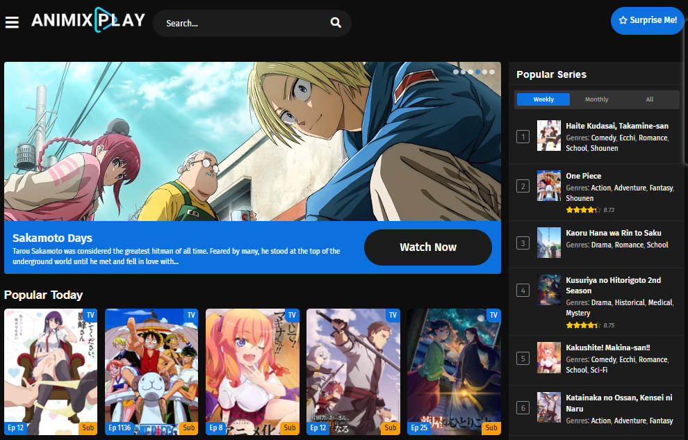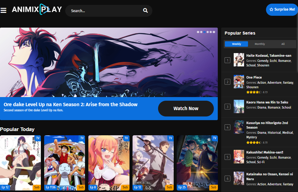AniMixPlay is a multi-platform anime streaming service designed to cater to fans of Japanese animation by offering thousands of titles free of charge. Its sleek interface and minimal loading times make it a user-friendly solution for discovering and streaming anime on-the-go or at home. The service categorizes anime by genres such as action, fantasy, romance, horror, and isekai, making it easy to navigate and find new shows or classics.