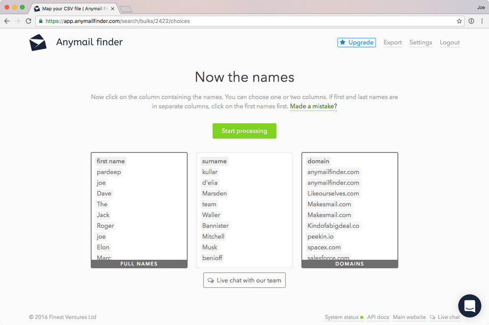 The ability to find emails of lists we already have in a fast way.