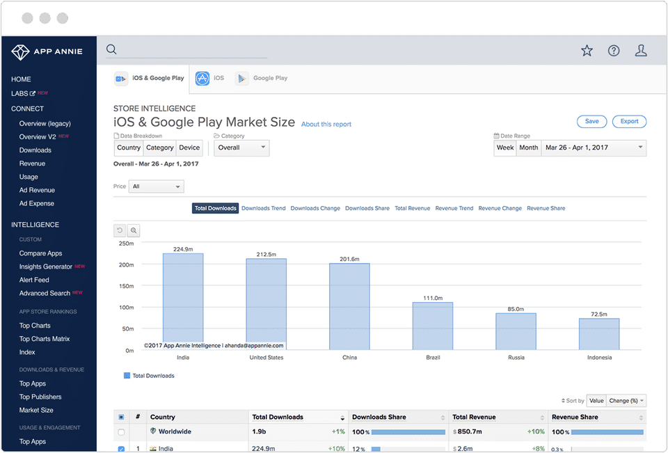 It really has a 360º view of apps metrics, allowing to keep track of your competitors movements and your real position on the market.