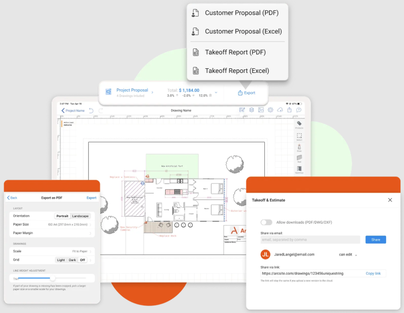As users draw, ArcSite generates real-time material takeoffs and estimates. Contractors can load their own inventory, materials, and labor costs to produce highly accurate proposals. The platform also supports customizable pricing tiers, such as “Good/Better/Best,” enabling flexible client presentations. Proposals can be branded with company logos, colors, and automatically include e-signature fields for fast approvals.