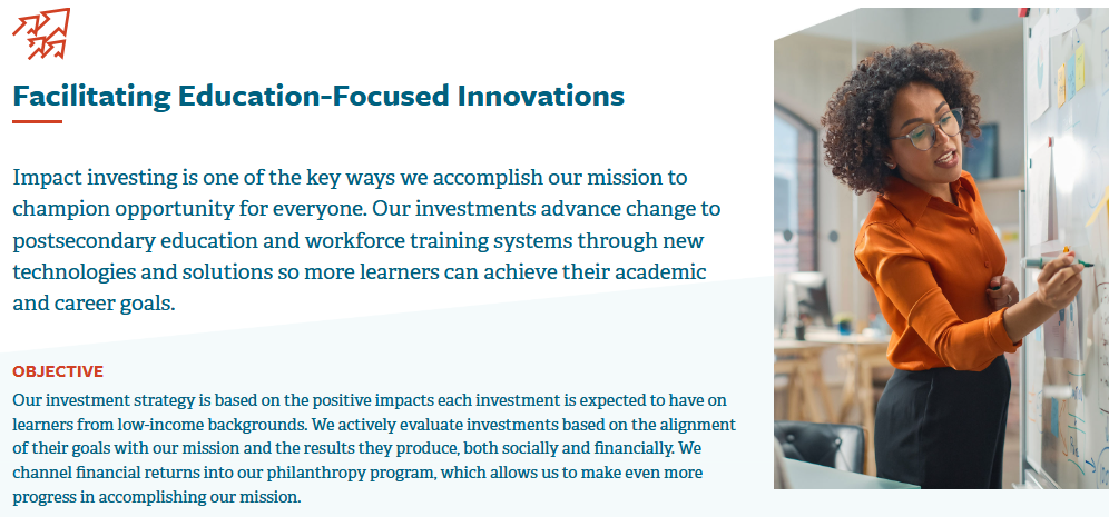 Education Impact Investments: Strategic investments in innovative companies transforming education and workforce training.