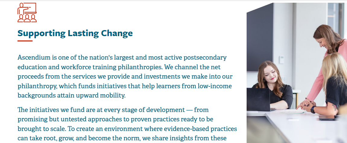 Through its comprehensive approach—encompassing financial services, success solutions, philanthropy, and strategic investments—Ascendium strives to create a more equitable and effective postsecondary education landscape. By addressing both individual and systemic challenges, the organization works to ensure that all learners, regardless of their background, have the opportunity to achieve their educational and career goals.