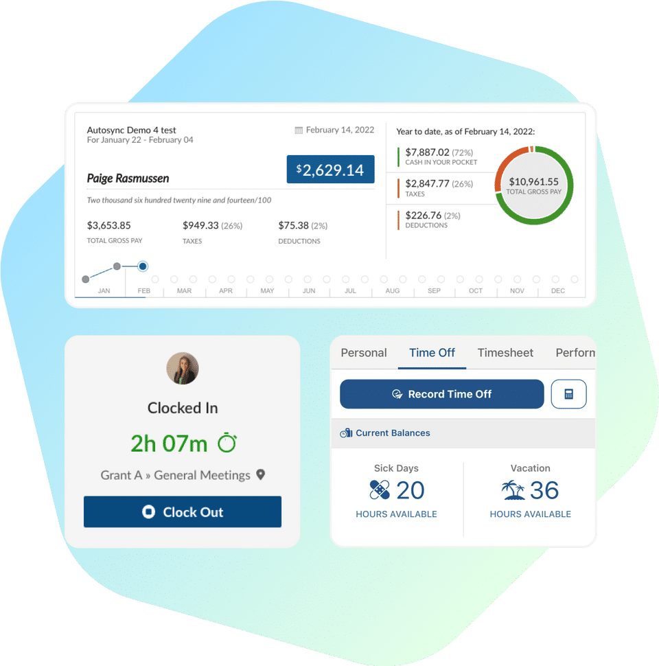 - Time Tracking – Allows employees to log hours and request time off easily.
