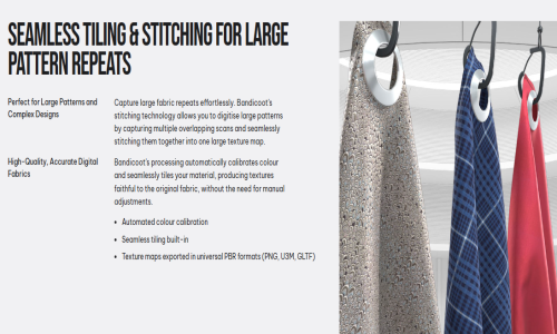 Bandicoot Imaging provides streamlines the process, enabling quick and effortless digitization. With a simple nine-photo scanning technique, users can capture a fabric’s texture in under a minute. These images are then processed in the cloud to generate seamless, high-resolution digital materials with accurate color calibration. The software’s proprietary technology ensures seamless textures, allowing designers to work with tiled or untiled fabric versions. The automatic color calibration feature, powered by integrated white balance chips and computer-readable patterns, ensures that the digital version closely matches its physical counterpart.
