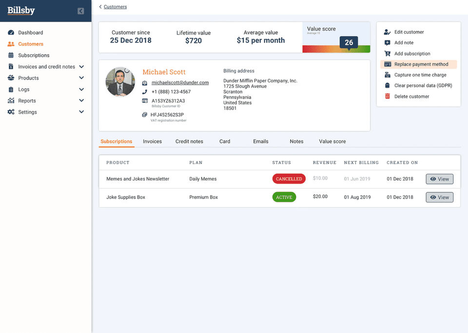 Some parts of the dashboard aren't as complete as other more nature products. This can be worked around via the fully featured API and Billsby seem to be adding more and more into the dashboard but we would really like to manually create subscriptions for users with no card details.