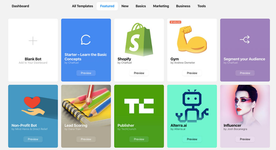 Thanks to different templates provided by the platform it's easy to start creating chatbots.