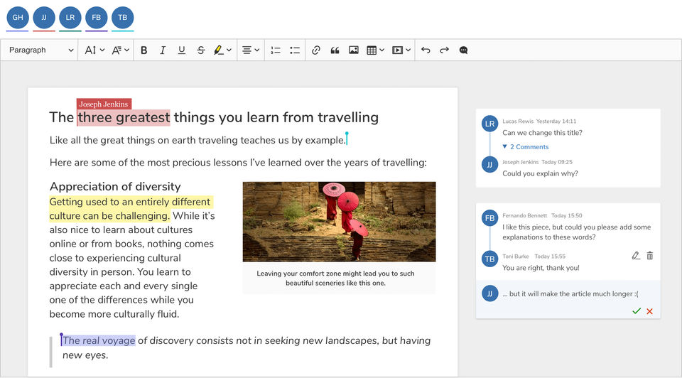 Offer your users the Google Docs-like writing experience they expect so they can centralize their content creation and review process, both asynchronously and in real time. Features like comments, track changes, revision history, support collaborative content workflows for even the most distributed teams.