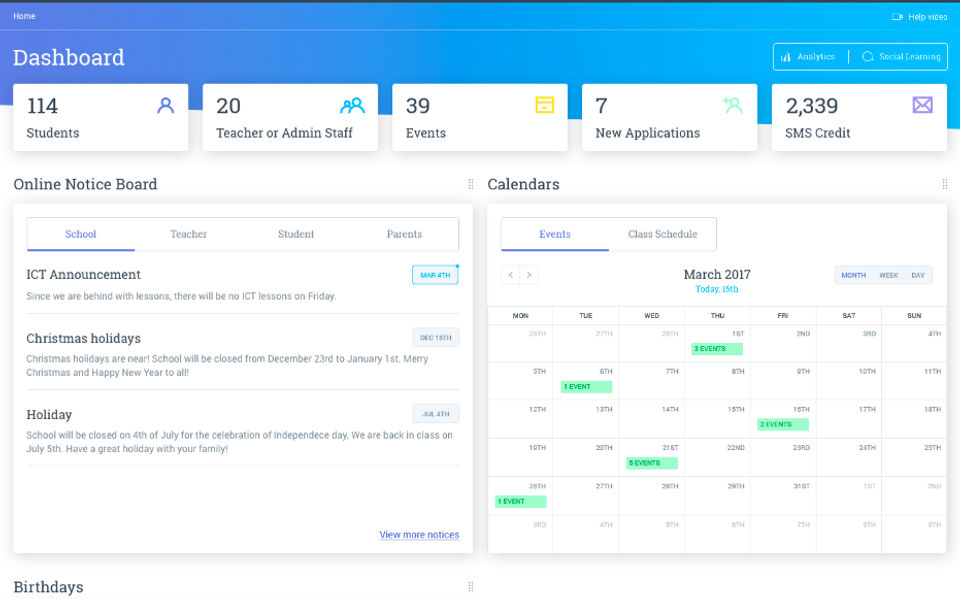 There are a number of modules like Alumni, Fees etc, which all cost extra. We got charged for a module our principal accidentally clicked on. Despite us never using it, Classe365 did not mention nor confirm the newly added subscription but instead charged the credit card. Any attempts to get a refund of the money for that module which we never intentionally signed up for did not work. Instead they made up all different excuses like they can't repay to any other credit card other than the one initially charged (that credit card expired in the meantime) and eventually stopped replying to emails.