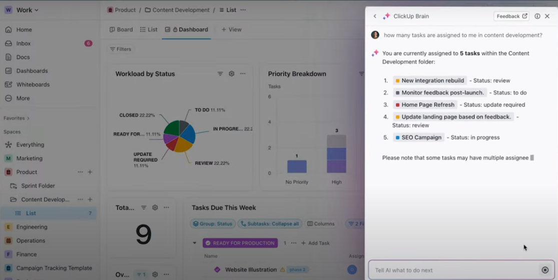 AI assistant (ClickUp Brain) for task automation and suggestions