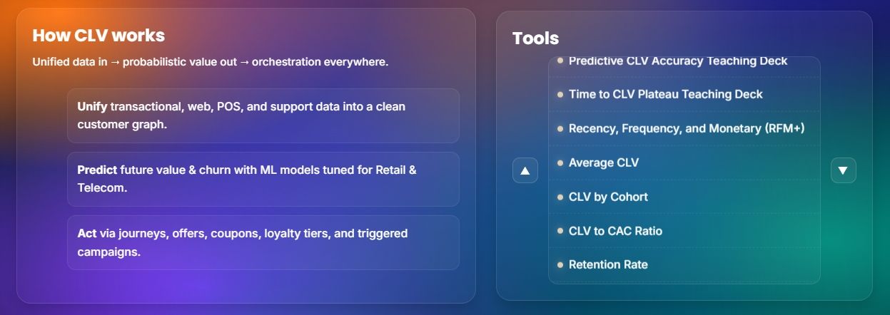 Once the scores are computed, CLV by Ai-InteleKt allows marketers to segment customers based on value tiers, identify high-risk cohorts for proactive retention, and activate audiences immediately — via email, SMS, ad platforms or in-store POS — to trigger the right offer or journey. For example, an at-risk but high-value customer might receive a tailored loyalty upgrade, while a high-intent mid-value customer might get a cross-sell coupon. The platform also provides dashboarding and KPI tools: CLV by cohort, CLV to CAC ratio, retention rate, churn rate, RFM+ metrics, and time-to-CLV plateau. The emphasis is on turning analytics into action: one-click audience exports, offer-optimisation (finding the discount that drives margin instead of burning it), and journeys that dynamically respond to user behaviour rather than static branching logic.