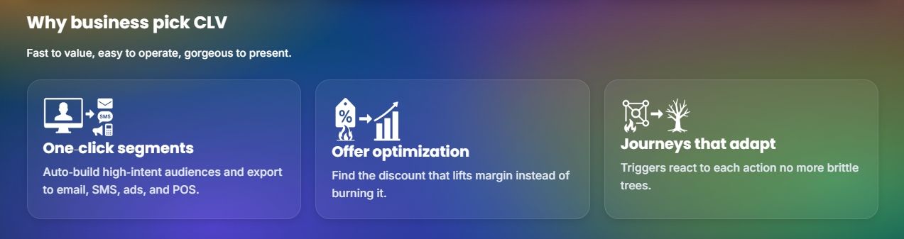 Businesses adopt CLV by Ai-InteleKt because it offers fast value: rapid audience activation, clear lift metrics, and improved marketing ROI. It is particularly useful for organisations seeking to move from “blast and hope” outbound campaigns to precision retention and growth strategies. By prioritising high-value customers and reducing churn, firms can reallocate acquisition budgets more effectively and improve overall profitability. While technical teams might prefer building bespoke models, this solution favours business-users with embedded workflows and integrations, enabling marketing operations teams to execute without extensive data science overhead.