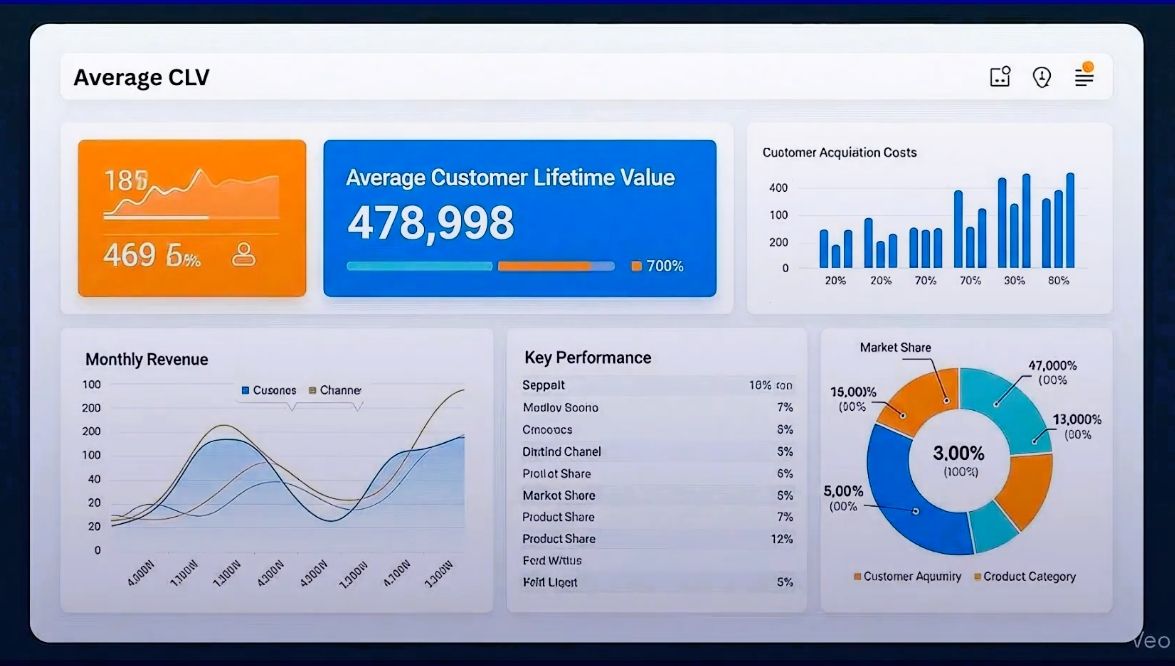 CLV analytics: CLV by cohort, CLV to CAC ratio, retention & churn metrics.