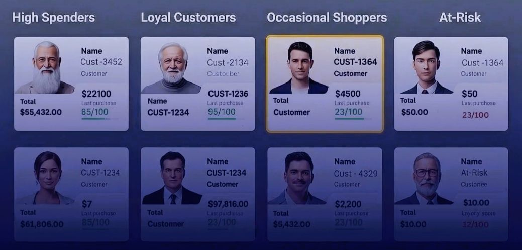 Predictive scores: future customer value, churn risk, purchase intent.