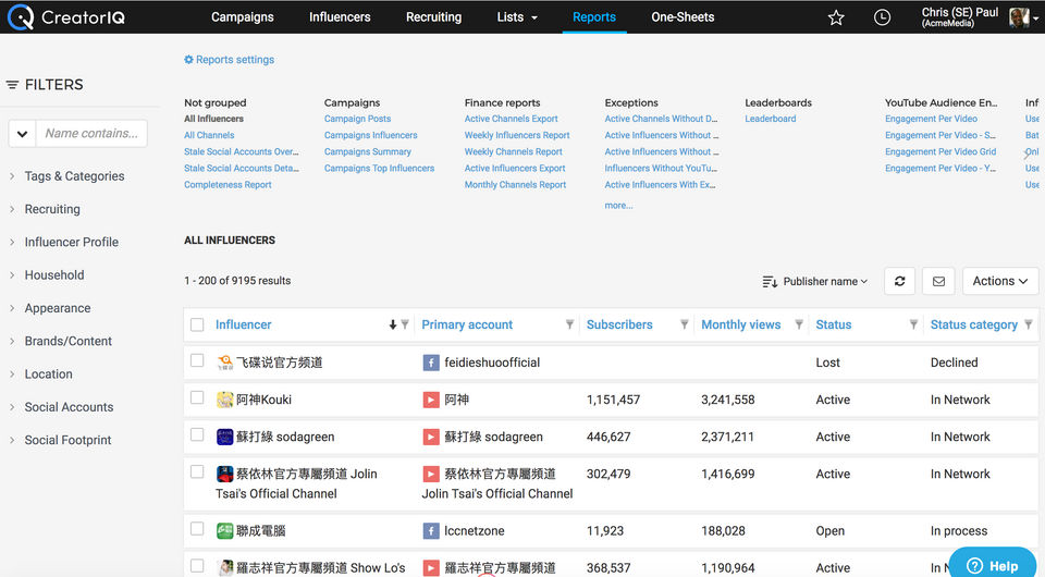 CreatorIQ is helpful in the aspect that there aren't many platforms of it's kind. You can search for influencers on various platforms - mainly YouTube, Facebook, Twitter, Instagram. On top of that, the platform pulls in the influencer's followers on social channel and engagement. I like the report setting which quickly allows you to pull together posts that influencers have gone live with. It's quick and easy.