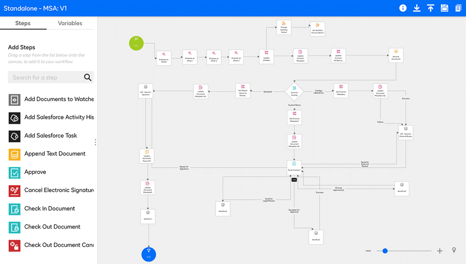 The workflow tool is powerful and can do some pretty cool and advanced things. Attributes give incredible flexibility in organizing documents, syncing with Salesforce or other systems.