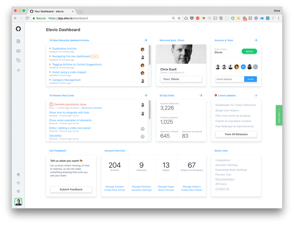 Elevio helps us automate and streamline our customer support. Being a small team, having self-serve resources is critical for us in order to scale our operations. Elevio definitely helps with this.
