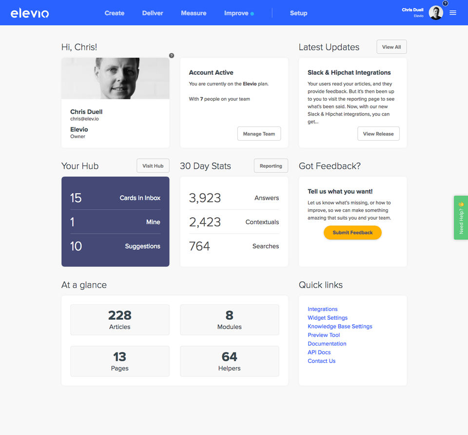 We use elevio for our customer help center knowledge base, virtual walkthroughs and chat support. The tool is simple, elegant and user-friendly. It's easy to implement and manipulate over time. The dashboard is straightforward.
