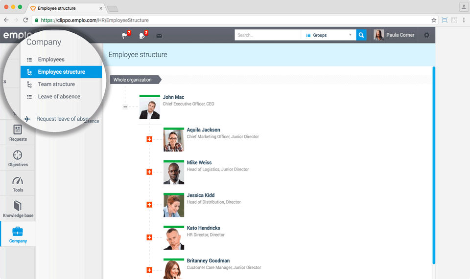 We like that we can see the company structure, we can find info about our colleagues, the news feed, the knowledge base, the requests, that we can see, approve and plan our holidays.