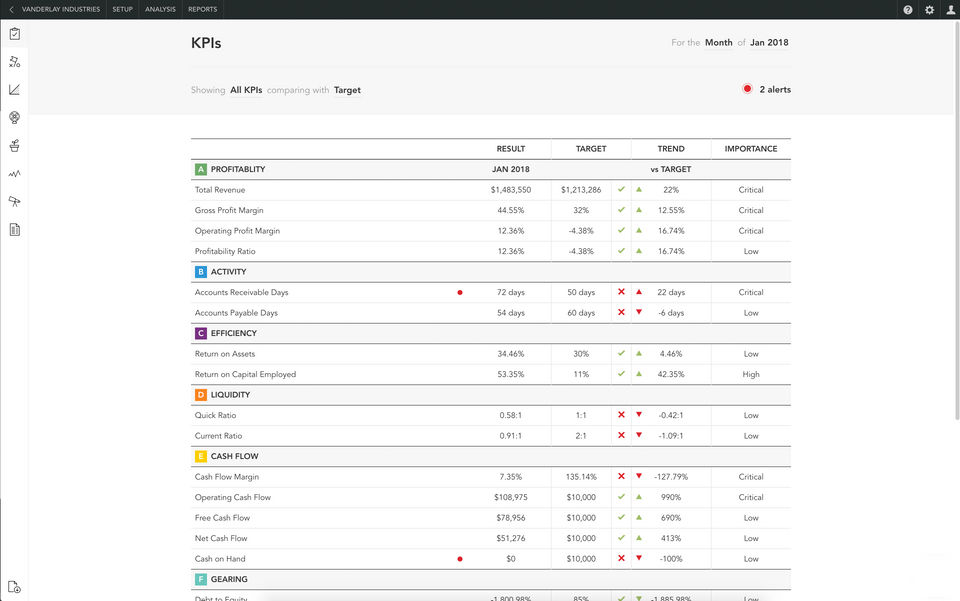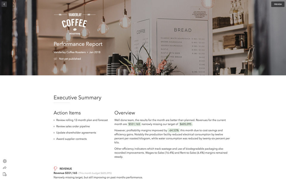 I like the ease it can pull financial data from Quickbooks Online and, after setting a few KPIs, can produce a repeatable report easy for business owners to read who don't want to stare at a sheet of numbers. The ability to update each quarter with ease is great and perfect for some key board reports.