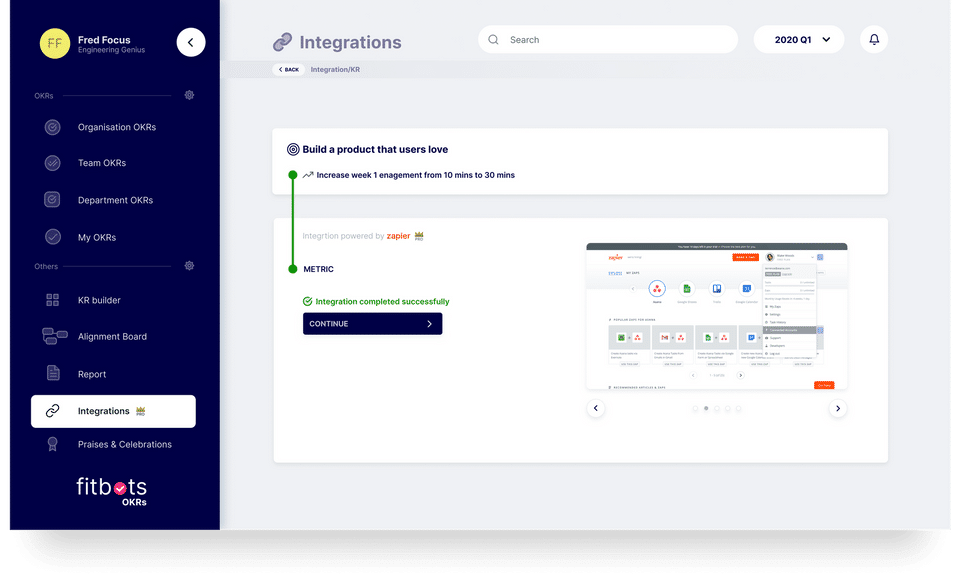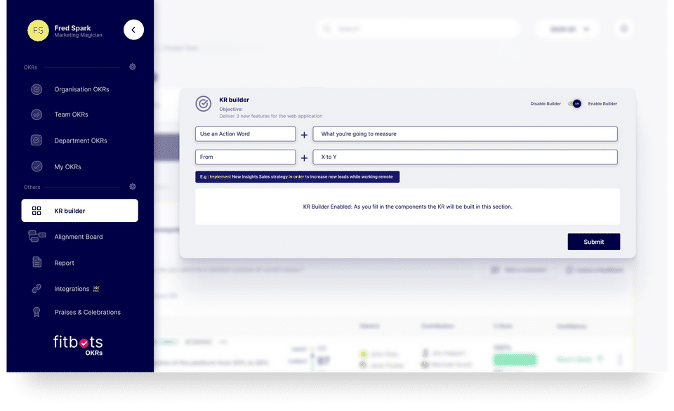 Using Fitbots begins with setting your organization's high-level strategic goals. From there, teams and individuals can create aligned OKRs using intuitive templates and guided frameworks. Weekly or monthly check-ins keep progress updated and highlight blockers early. The platform allows comments, updates, and automated reminders to keep everyone in sync. Dashboards provide real-time visibility into progress, alignment, and team engagement. Fitbots also offers OKR review features to reflect on outcomes and plan the next cycle. With certified OKR coaches available, your teams get continuous support on goal quality, focus, and implementation.