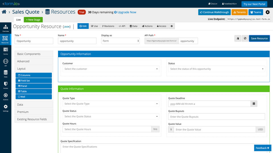 Form.io is the Online Form Builder Software used for the below functionalities.