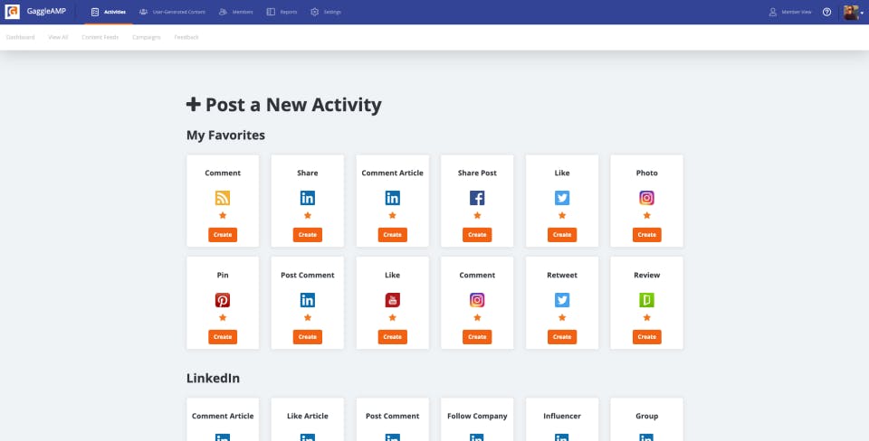 Companies use GaggleAMP to curate and distribute approved content to employees via a centralized platform, called a "Gaggle." Participants, known as members, can choose to engage with content through suggested social media actions like sharing posts, liking content, or commenting — all managed within a user-friendly dashboard. Administrators can create campaigns, assign tasks, and monitor who participates, making it easier to manage employee advocacy programs at scale.