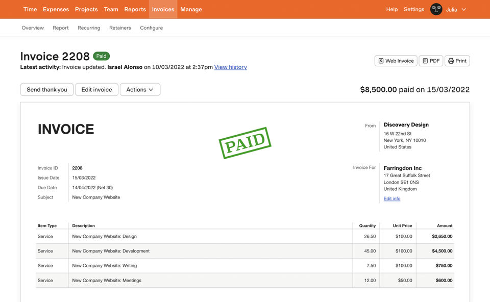 We find it much easier to manage our invoicing with another application which allows us to track our business expenses directly with our business accounts etc. in one place. Harvest doesn't allow us to do this which is limiting, and so we only use it for employees to track their time spent on various client and office projects.