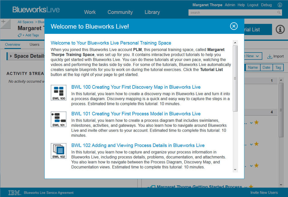 IBM Blueworks Live provides Help Guides,Blogs,Video Guides for the software training.