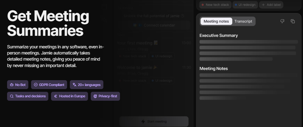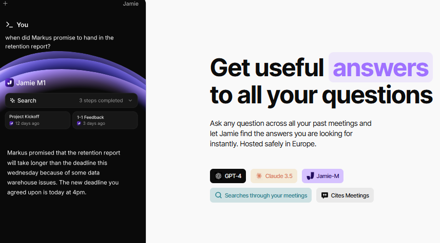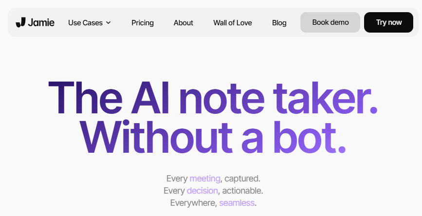 Jamie transforms traditional note-taking by using advanced AI to deliver automated, highly accurate meeting transcriptions and summaries. By eliminating the need for a human notetaker or a digital meeting bot, it ensures privacy while maximizing productivity. The tool works quietly in the background, extracting the most important points from each discussion, including decisions and action steps. Jamie stands out for its adaptability. It supports over 20 languages and can be used across different meeting platforms, including remote and in-person settings. Users can define custom note templates, teach Jamie specific terminology relevant to their industry, and get notes formatted exactly how they need them.