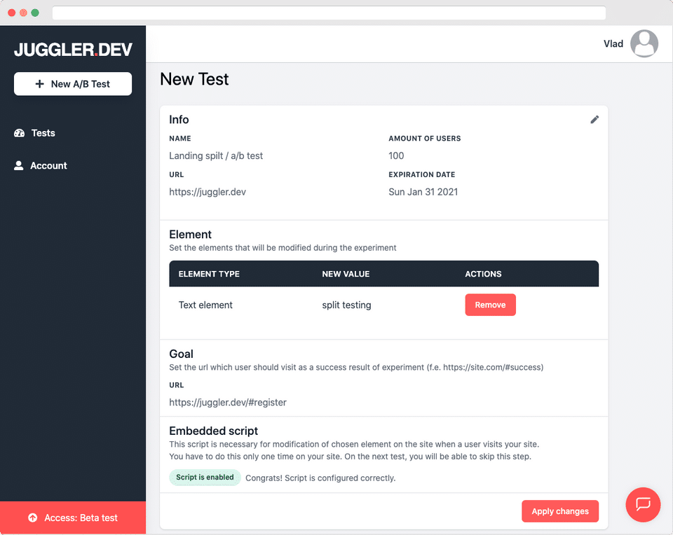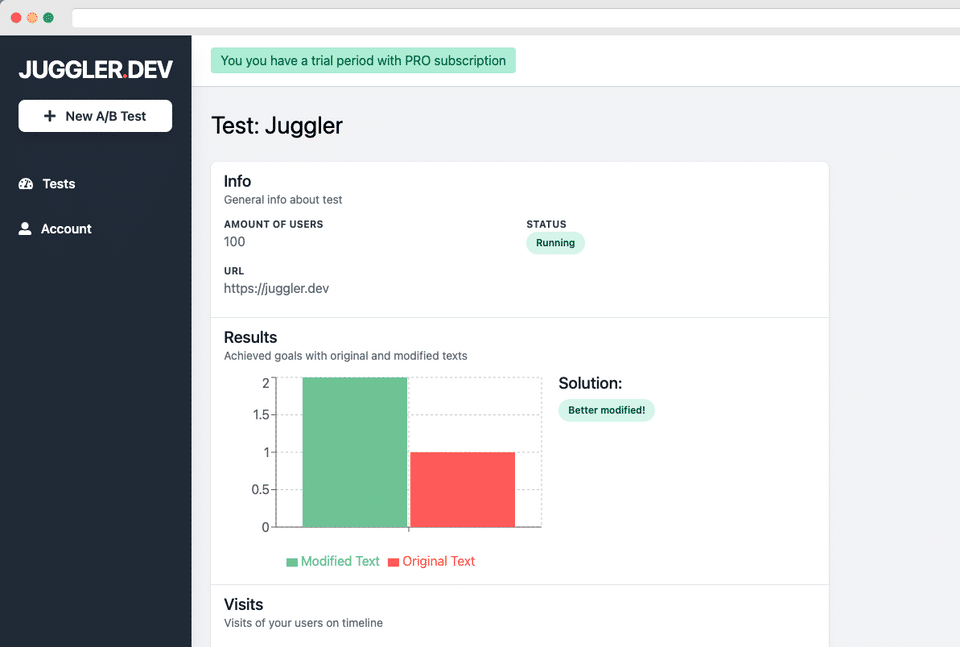 Juggler.dev is the AB Testing Software used for the below functionalities.