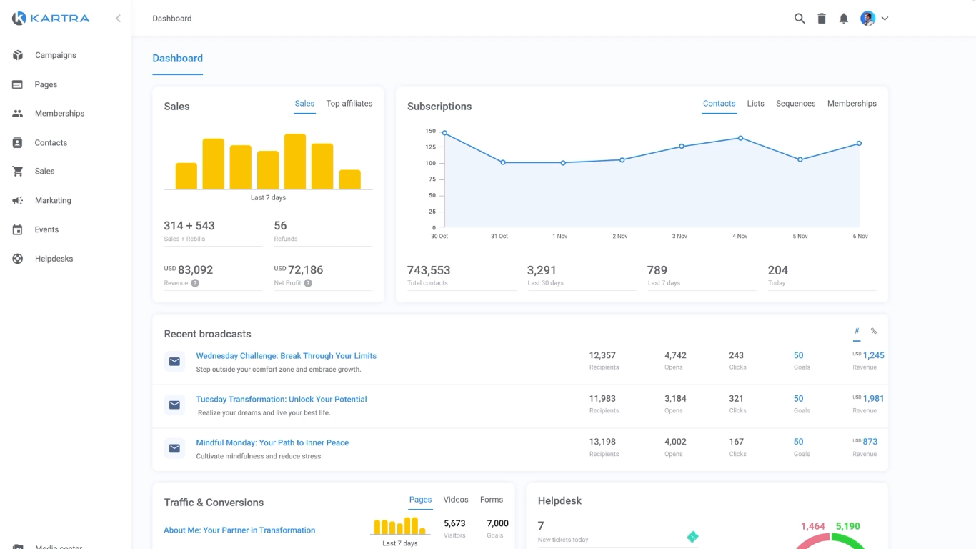 Kartra also includes built-in video hosting with engagement analytics, a membership portal builder for delivering online courses or gated content, and a robust affiliate management system for promoting products through partnerships. Its helpdesk and live chat features make customer support part of the same ecosystem.