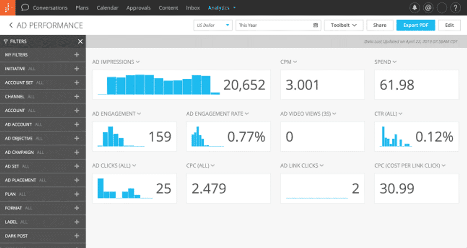 Do not use Spredfast. There are better tools for less money. Spredfast does offer unique features that are not often matched, however, the number of issues, difficulty working with support, and overall lack of reliability override any benefits