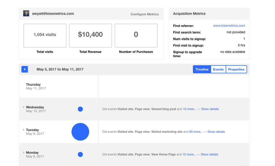 Kissmetrics is the Web Analytics Software used for the below functionalities.