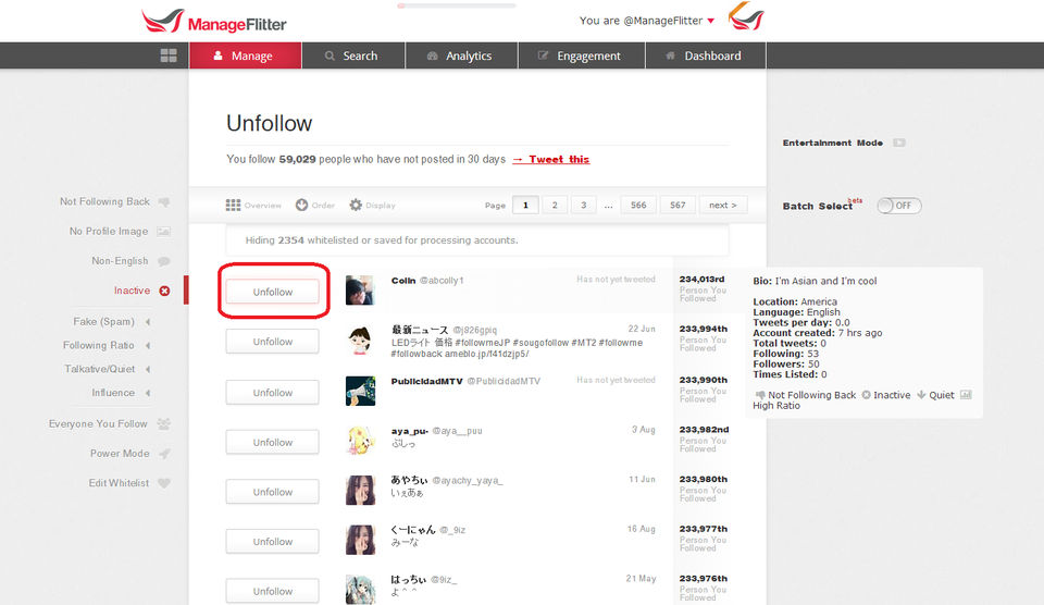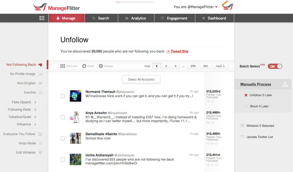 The options for searching and targeting the right twitter following is limitless on Manage Flitter. The tool is incredible at helping you build your Twitter following and creating your tribe.
